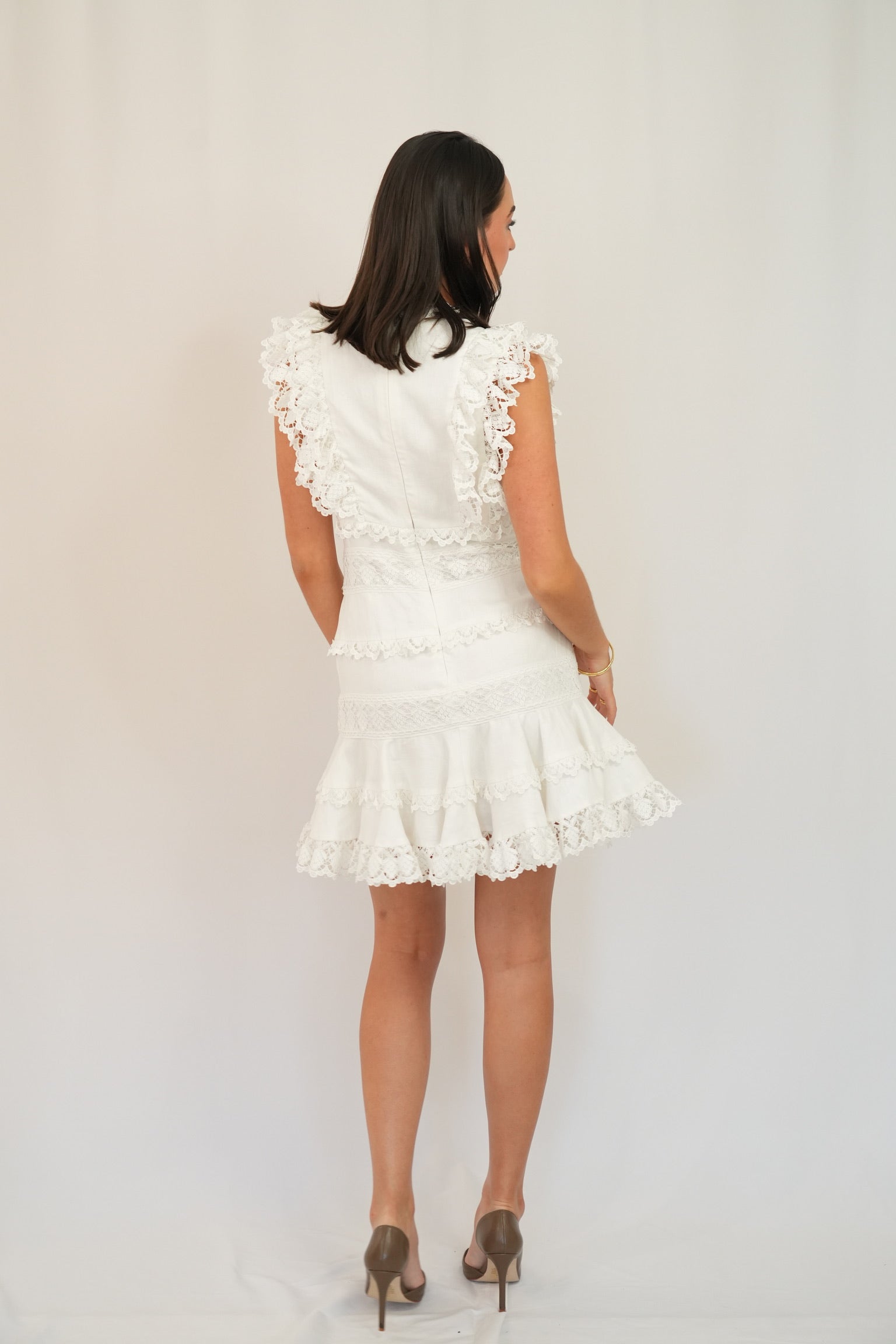 Model wears S. A feminine mini dress with delicate lace detailing throughout. Featuring a deep V neckline, flutter sleeves and a softly tiered skirt, this lightweight silhouette offers an effortlessly flattering fit perfect for daytime events or summer occasions. An exclusive SAS Rentals style, can try it on before you rent.