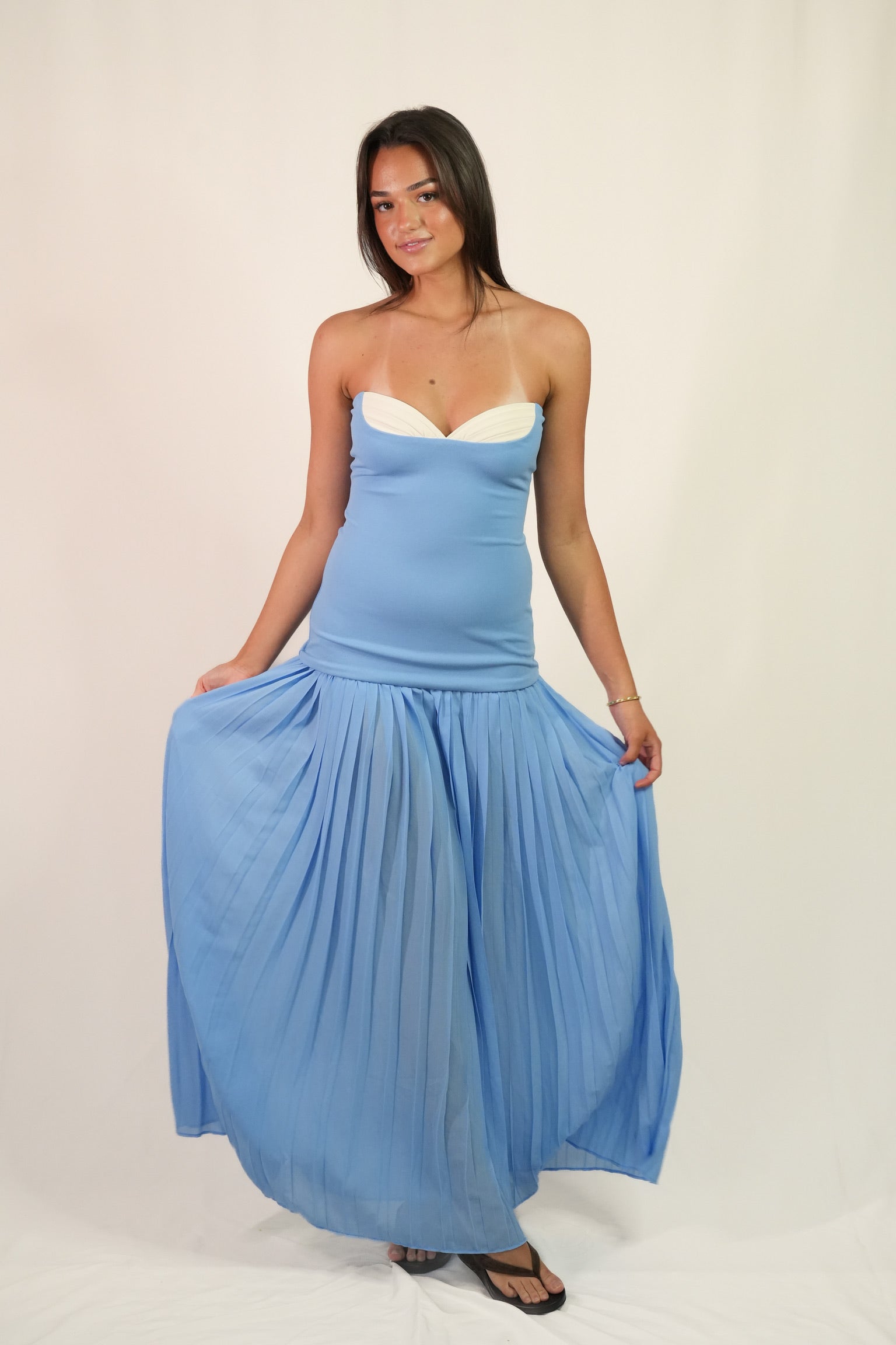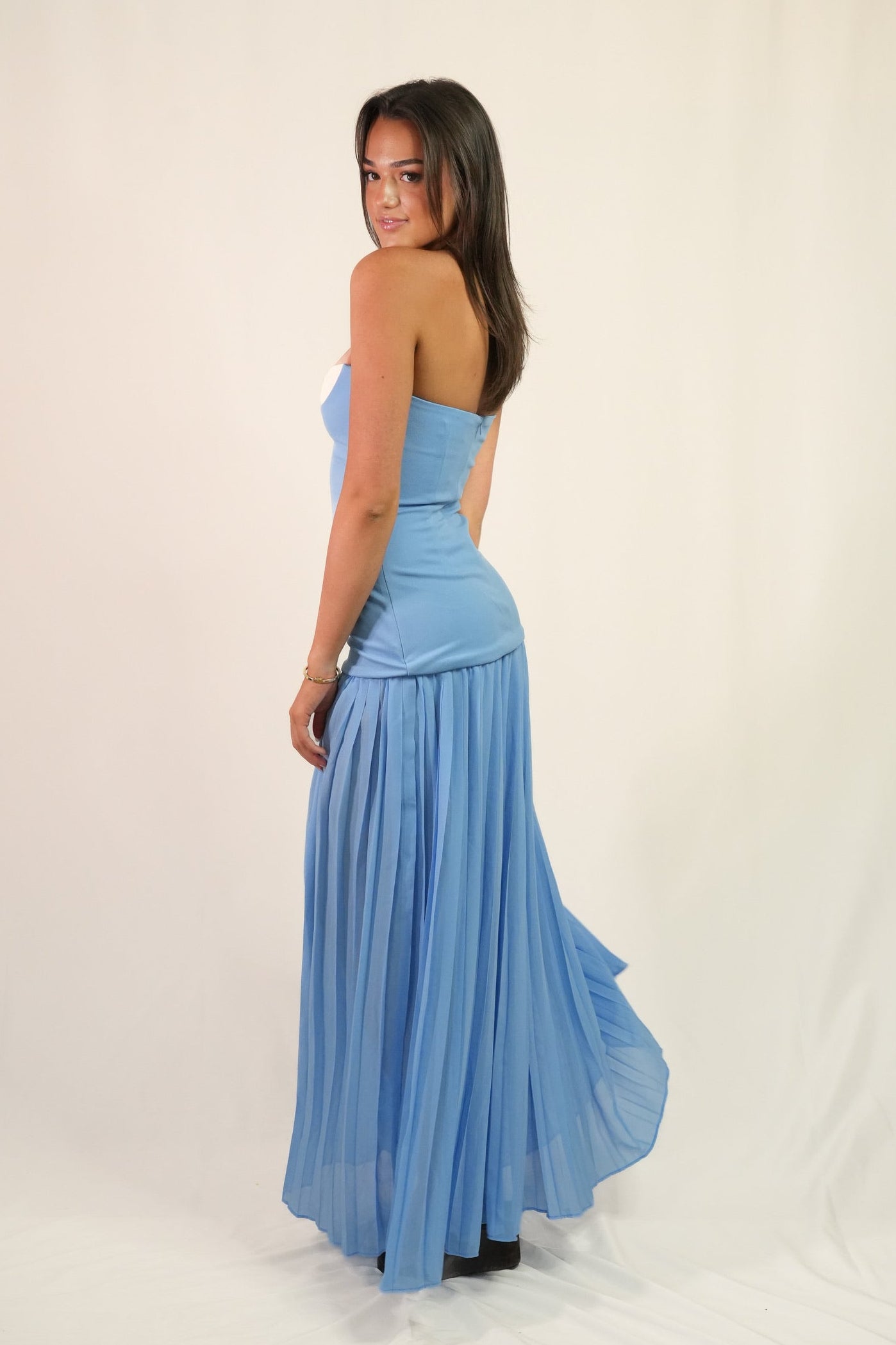 Model is 173cm and wears S. An elegant strapless maxi featuring a sweetheart neckline, drop-waist silhouette and flowing pleated skirt, perfect for formals, weddings and black-tie events. An exclusive SAS Rentals style, can try it on before you rent.