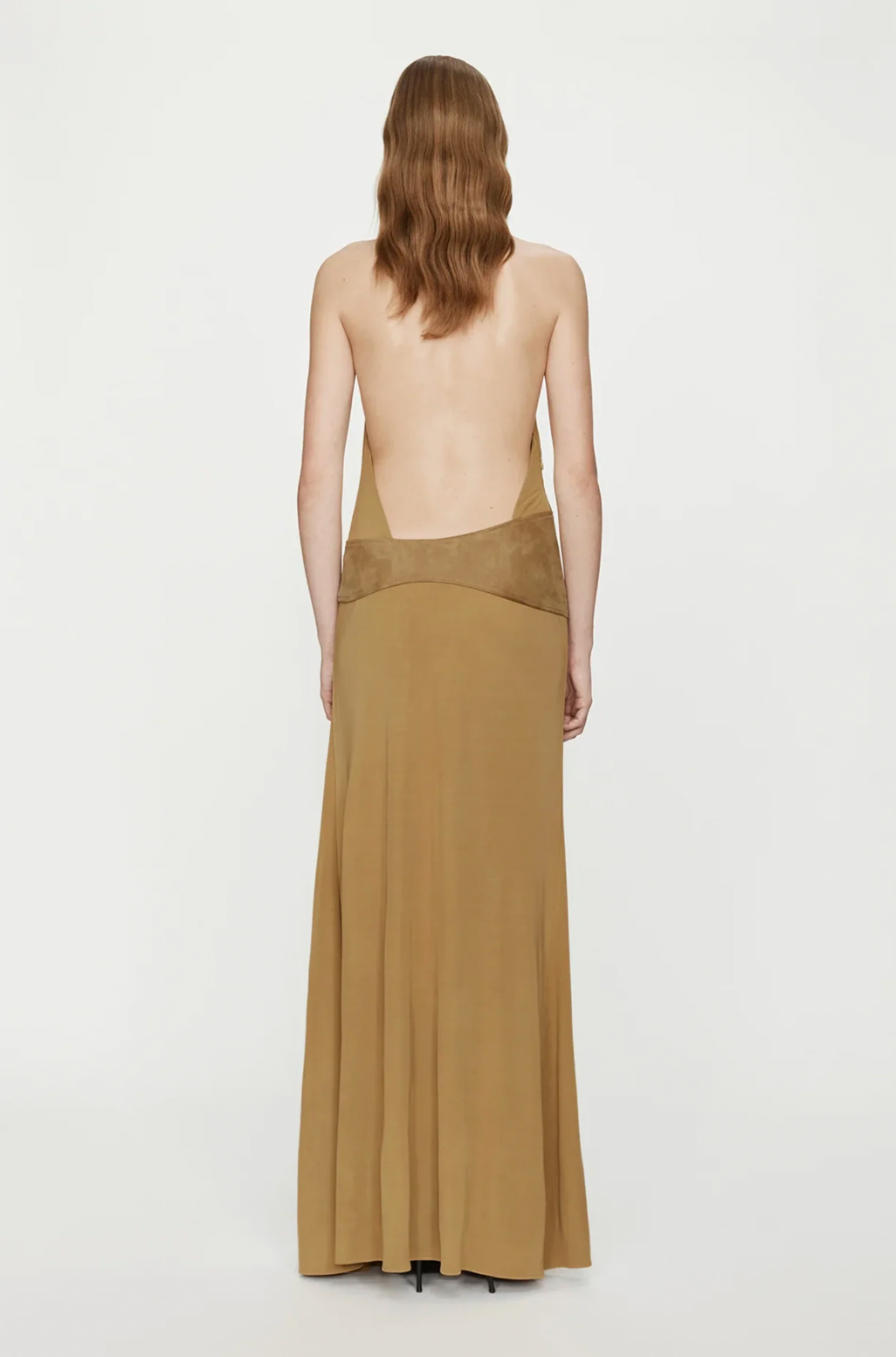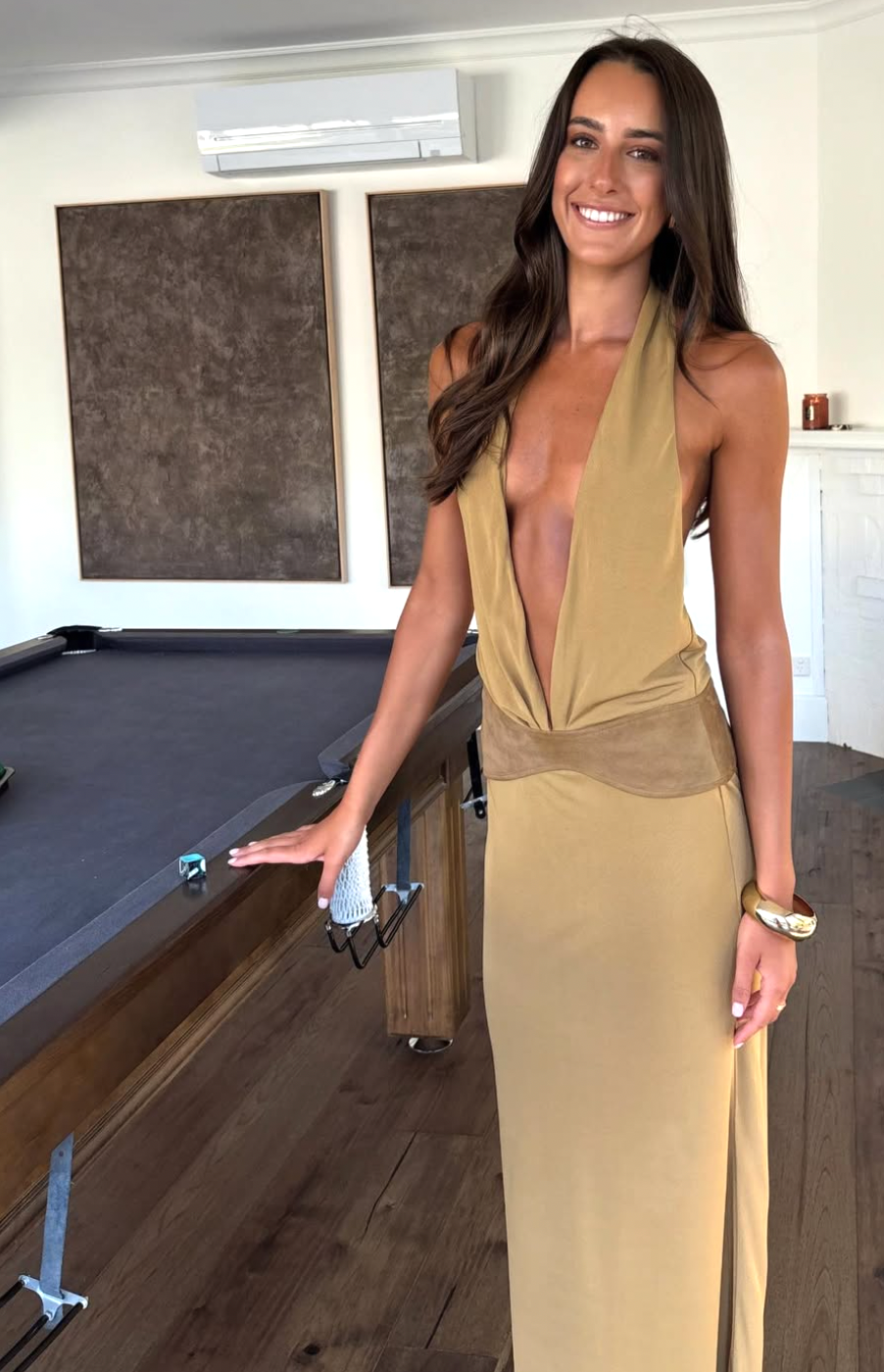 The Zinnia is a sleek halter gown crafted from soft stretch jersey for a comfortable, body-skimming fit. Designed with a deep plunge neckline, open back and floor-length hem, finished with a suede-look waist detail that defines the silhouette. An exclusive SAS Rentals style, try it on before you rent.