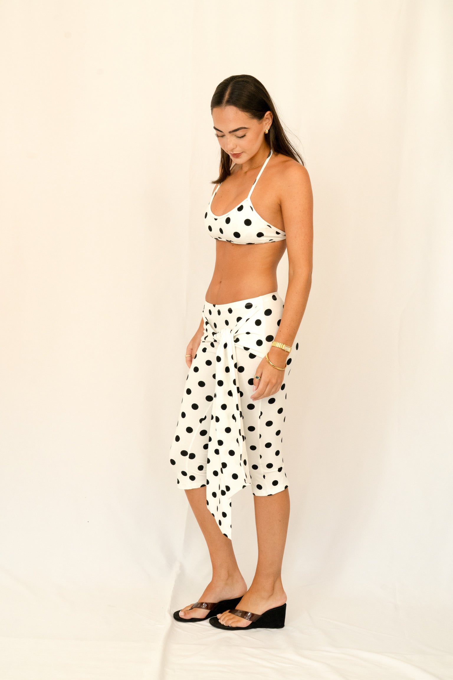 Model is 167cm wearing S. The Lucy is a playful two-piece set crafted from soft stretch fabric for a flattering, body-hugging fit. Designed with a halter-style top and matching high-waisted wrap skirt, finished in a timeless black and white polka dot print that enhances the silhouette. An exclusive SAS Rentals style, try it on before you rent.